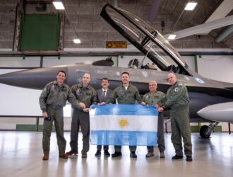 Luis Petri con los aviones de combate F-16 que compró el Gobierno argentino